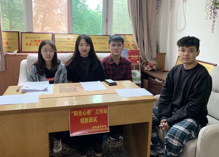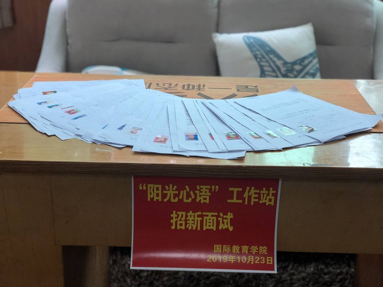 2019年10月23日中午一点太阳成集团tyc33455“阳光心语”工作站新一轮招新面试活动于行政楼311教室召开。阳光心语工作站站长丁玮老师以及工作站负责人郭猛、李垲熠、李珂均出席了本次面试并担任面试官。本次招新是为了给工作站注入“新鲜血液”,为同学们提供一个更广阔的学习空间,一个了解并热爱上心理的平台。