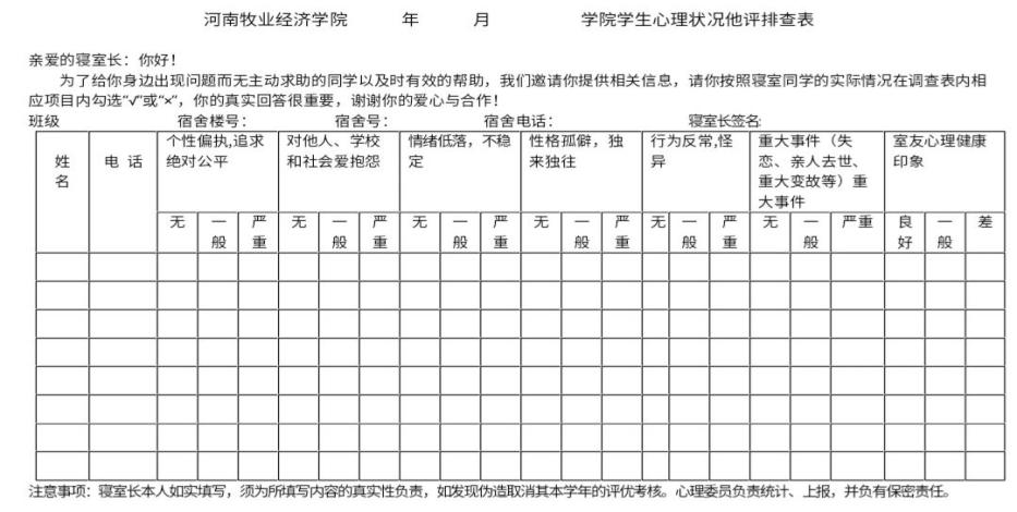 我院心教部于2020年10月13日至2020年10月16日对17,18,19,20级学生进行本月的心理健康排查工作,寝室长以寝室为单位进行统计,随后心理委员进行汇总并将结果发给团学会心教部干事,由心教部负责人收集后进行筛选,最后发给所属辅导员。辅导员根据具体情况对有心理问题的同学进行进一步谈话,深入了解指导。