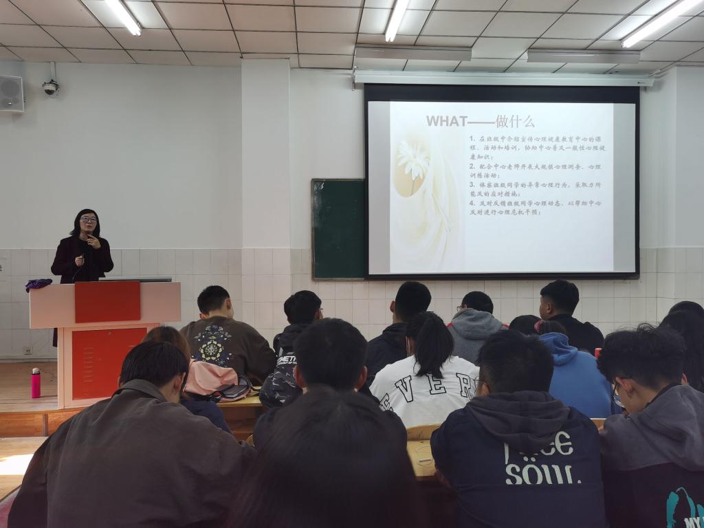 为向学生介绍和宣传心理健康课程,协助心理健康中心普及一般性心理健康知识,配合老师开展心理健康排查及反馈各班同学心理情况。太阳成集团tyc33455于2020年11月11号中午在教学楼E209教室开展心理健康排查与培训讲座,由心理中心老师陈莉担任主讲。