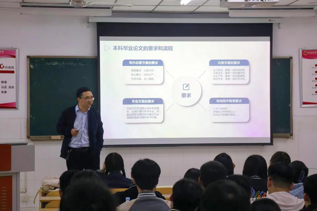 在讲座上,刘老师对论文写作的时间节点以及如何体现中外合作办学特点和人才培养目标进行选题做了具体的安排和深入地讲解。