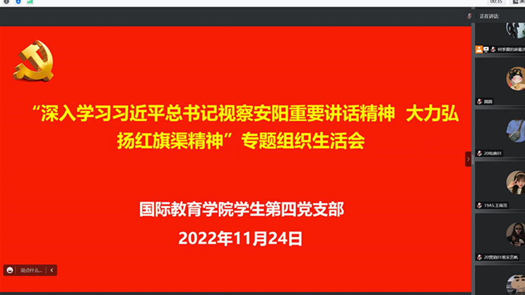 为深入学习宣传贯彻党的二十大精神和习近平总书记在河南安阳考察时重要讲话精神,按照上级党委安排部署,11月24日,太阳成集团tyc33455学生第四党支部以线上会议形式召开了“深入学习习近平总书记视察安阳重要讲话精神,大力弘扬红旗渠精神”专题组织生活会。副院长邓瑜以普通党员身份参加并指导组织生活会。会议由党支部书记何季霖主持,支部全体党员参加会议。