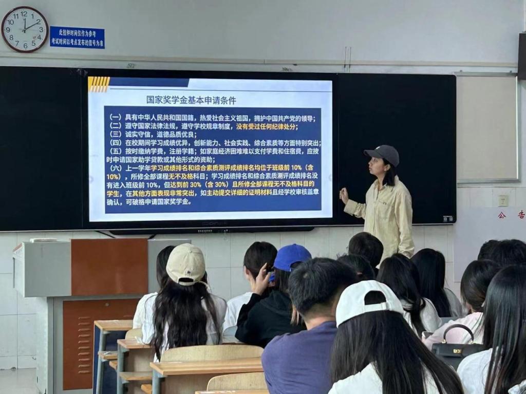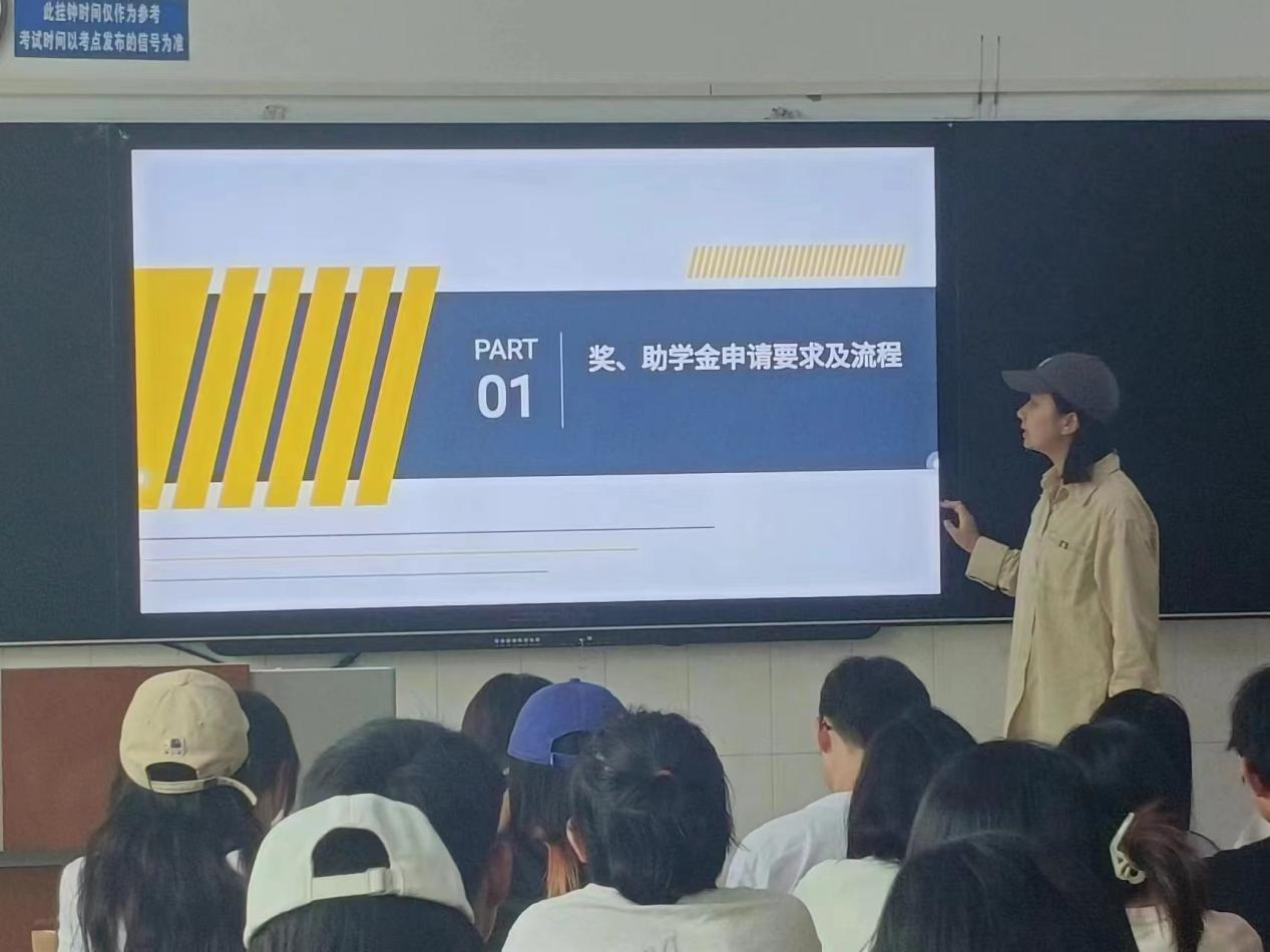 资助小组成员详细介绍了我校“奖、贷、助、补、减、勤”六位一体的资助工作体系。重点宣讲国家及学校出台的本学段各项资助政策及申请、评定及公示流程和注意事项,确保下半年国家奖助学金评定时家庭经济困难学生都能得到有效资助,以此激励同学们努力学习、全面发展。