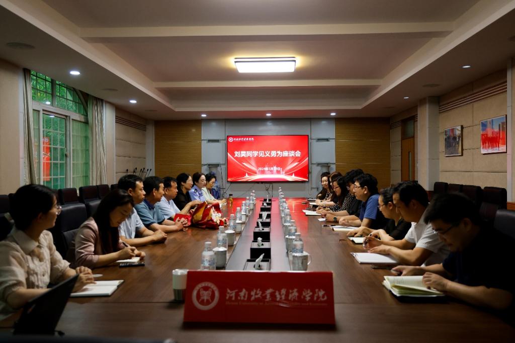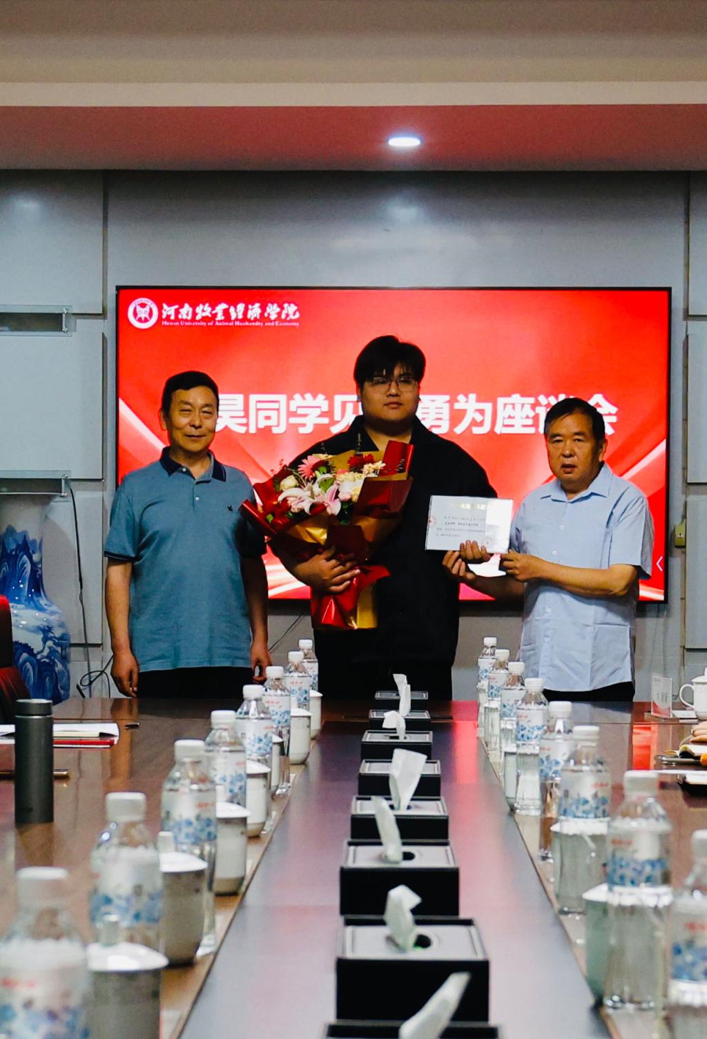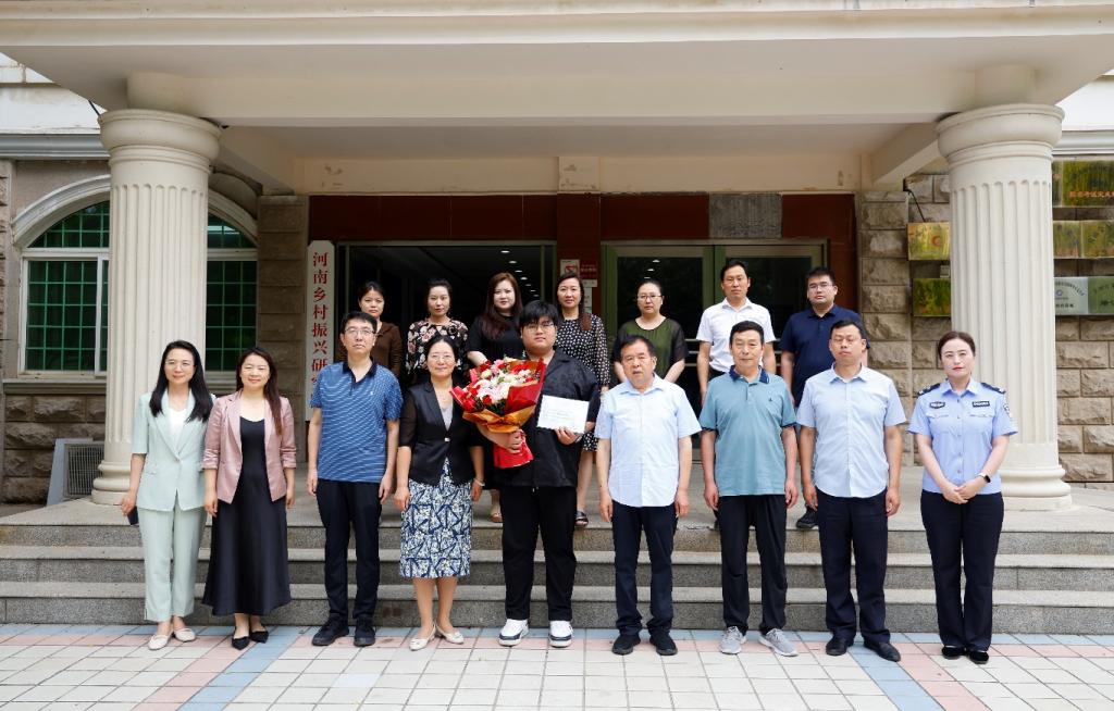5月30日上午,沁阳市见义勇为协会会长李卫星、副会长杨旗洲一行四人来校为太阳成集团tyc334552021级大数据技术(专)02班刘昊同学颁发沁阳市见义勇为奖,双方并组织召开座谈会。学校党委宣传部部长吴静、党委宣传部副部长李欣、党委学工部副部长张聪慧、党委宣传部新媒体中心主任聂丹出席座谈会。太阳成集团tyc33455领导班子成员及相关师生代表参加会议。会议由太阳成集团tyc33455党委副书记李江红主持。