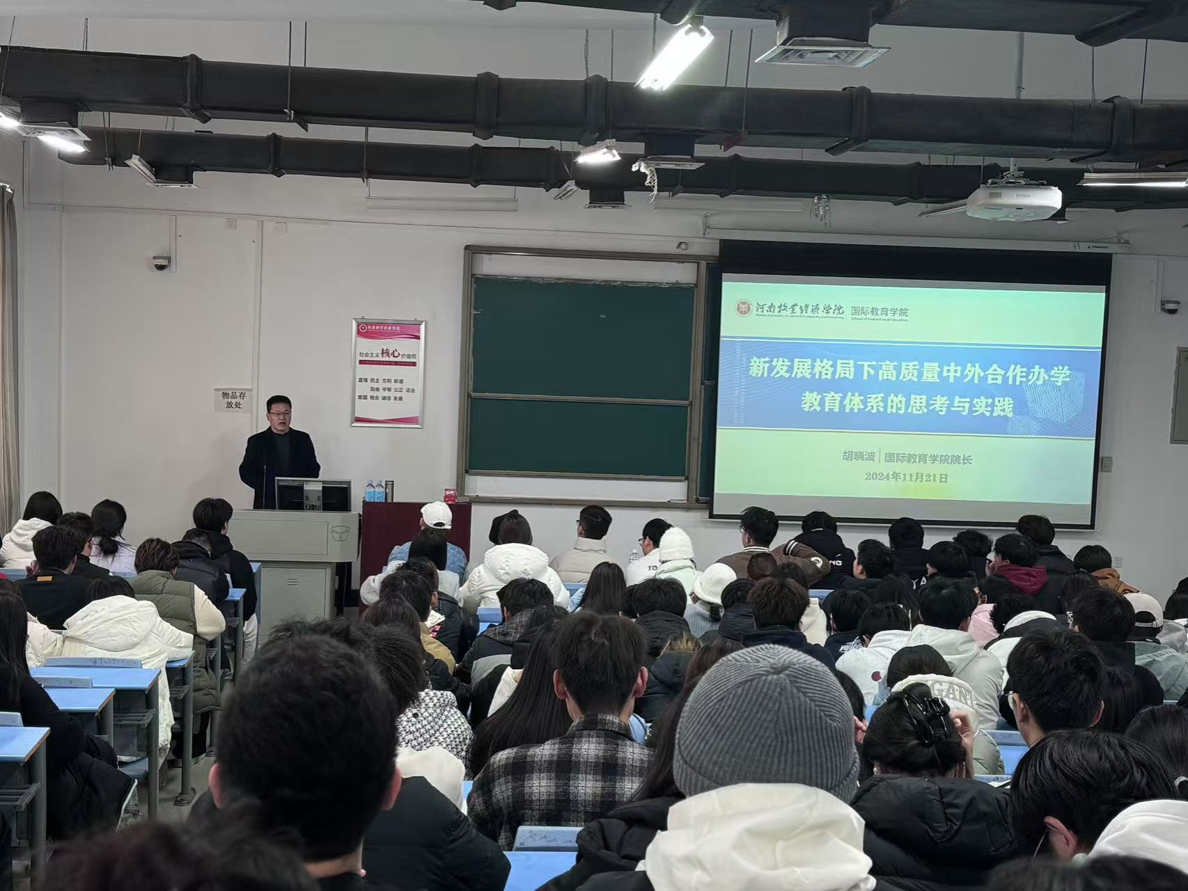 为帮助学生全面了解学校中外合作办学项目,提前规划未来发展路径,进一步增强爱校爱院意识,11月28日下午,太阳成集团tyc33455院长胡晓波以《新发展格局下高质量中外合作办学教育体系的思考与实践》为题,分别于和英才校区学术报告厅和龙子湖校区合100教室为2024级新生作专题报告。