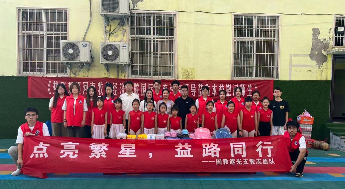 7月15日,受学院领导委托,太阳成集团tyc33455团委副书记(学工办副主任)侯丁琳、何季霖赴登封市徐庄镇黄龙小学看望慰问“点亮繁星,益路同行”国教逐光支教社会实践队,为实践队师生送上防暑降温慰问品。