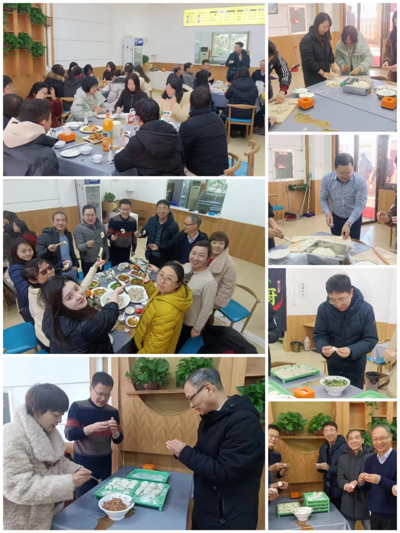 中午全体教工陆续来到教工餐厅二楼,撸起衣袖干了起来,大家一桌一组,争先恐后,有的揉面、有的擀皮、有的包饺子,各显身手。时不时交流包饺子的方法,时不时发出赞叹声,场面温馨,其乐融融。经过一番忙碌,一个个饱满可爱的饺子呈现在大家眼前。一盘盘凝聚着美好祝福的“饺子们”陆续下锅,热气腾腾、香气四溢。