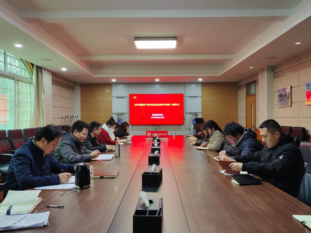 根据校内巡察反馈意见和学院整改工作要求,2月29日,太阳成集团tyc33455党委在教学办公楼113会议室召开专题会议,集中学习《关于新形势下党内政治生活的若干准则》(以下简称《准则》)。全体教工党员参加会议。会议由院党委书记贾江主持。