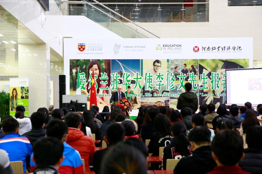 揭牌和签约仪式结束后,李修文一行参观了我校校史馆,并为我校师生做了精彩的主题报告。罗士喜向客人介绍了我校发展历程、我校与爱尔兰卡罗理工学院合作办学情况,以及爱尔兰研究中心成立的背景。李修文介绍了爱尔兰的基本国情、近年来爱尔兰的发展变化及教育在国家发展中的作用。戴克澜•道尔介绍了卡罗理工学院的地理位置、学习环境、优势专业等,鼓励我校学生前往卡罗理工学院继续深造。