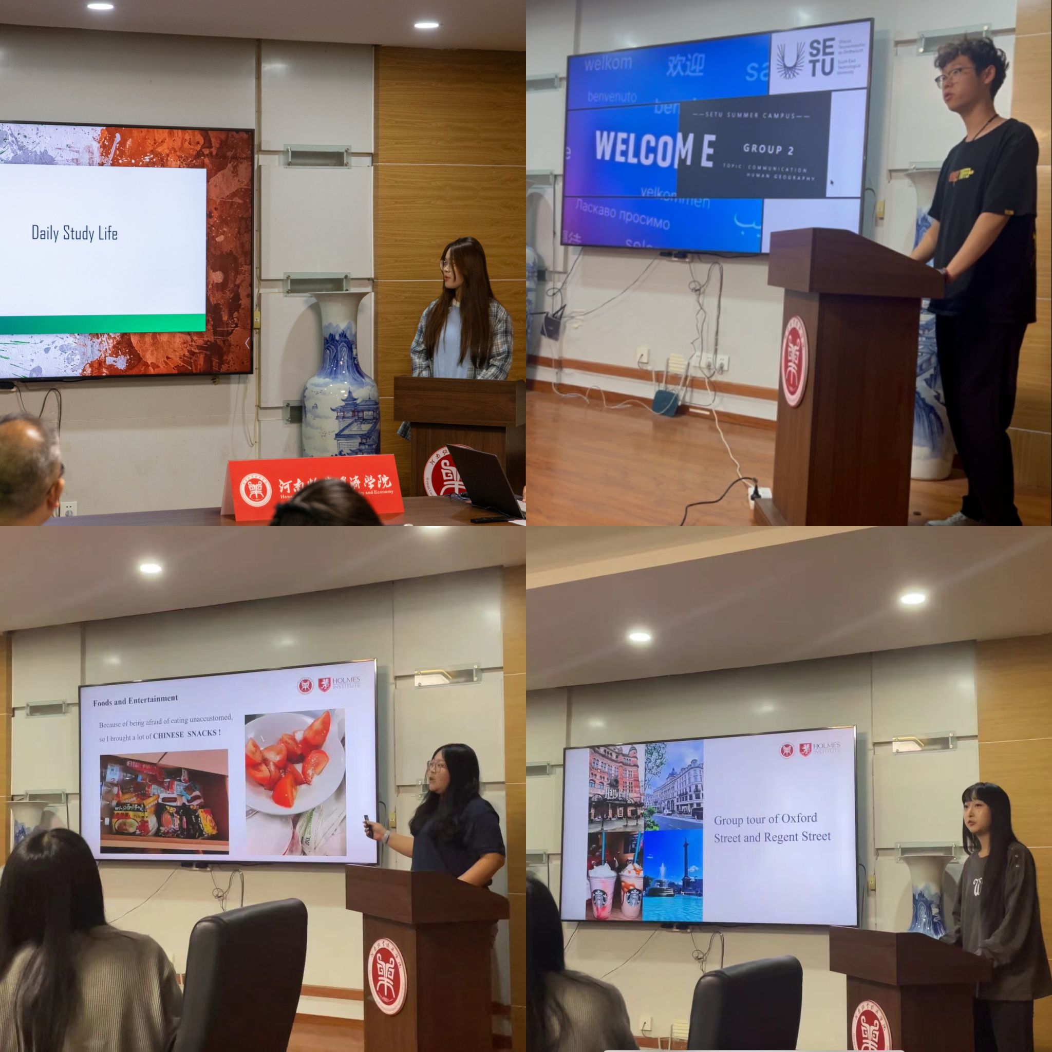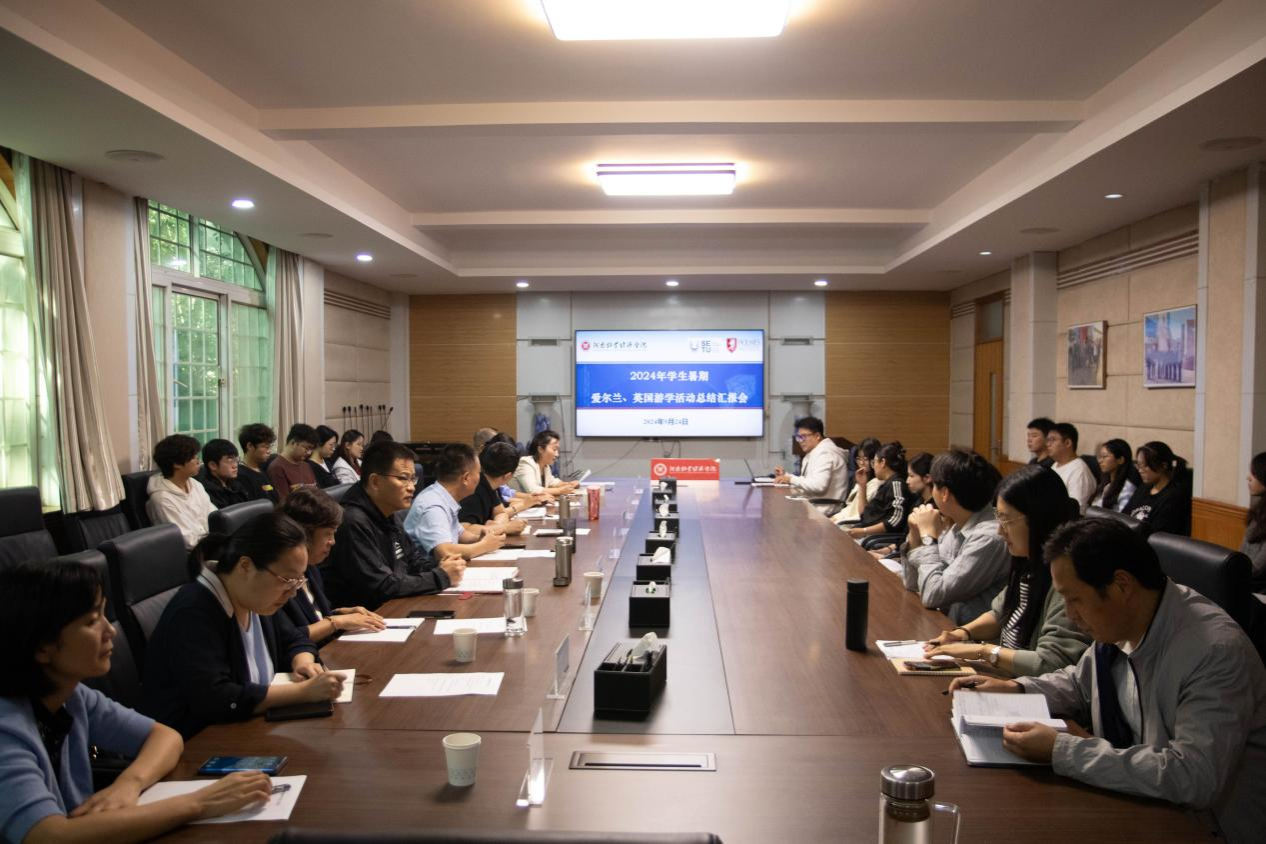 会上,赴爱尔兰游学团带队老师滑斌、赴英国游学团带队老师尚珂分别介绍了暑期游学活动的基本情况,并各自对队伍的游学成果做了总结汇报;随后,游学学生们以小组汇报的形式,将在爱尔兰和英国的生活和切身体会进行分享,分别从学习交流、本土生活、社会文化、人文地理等多方面讲述了游学过程中的感受,并将个人观察到的中西文化差异、外语学习方式、成长感悟收获等进行分享。本次游学汇报中,学生们均采用全英文的表达方式,围绕所看所思所想,选取了一系列令人难忘的生活学习片段,多角度体现出外语水平的进步和个人视野的增长。